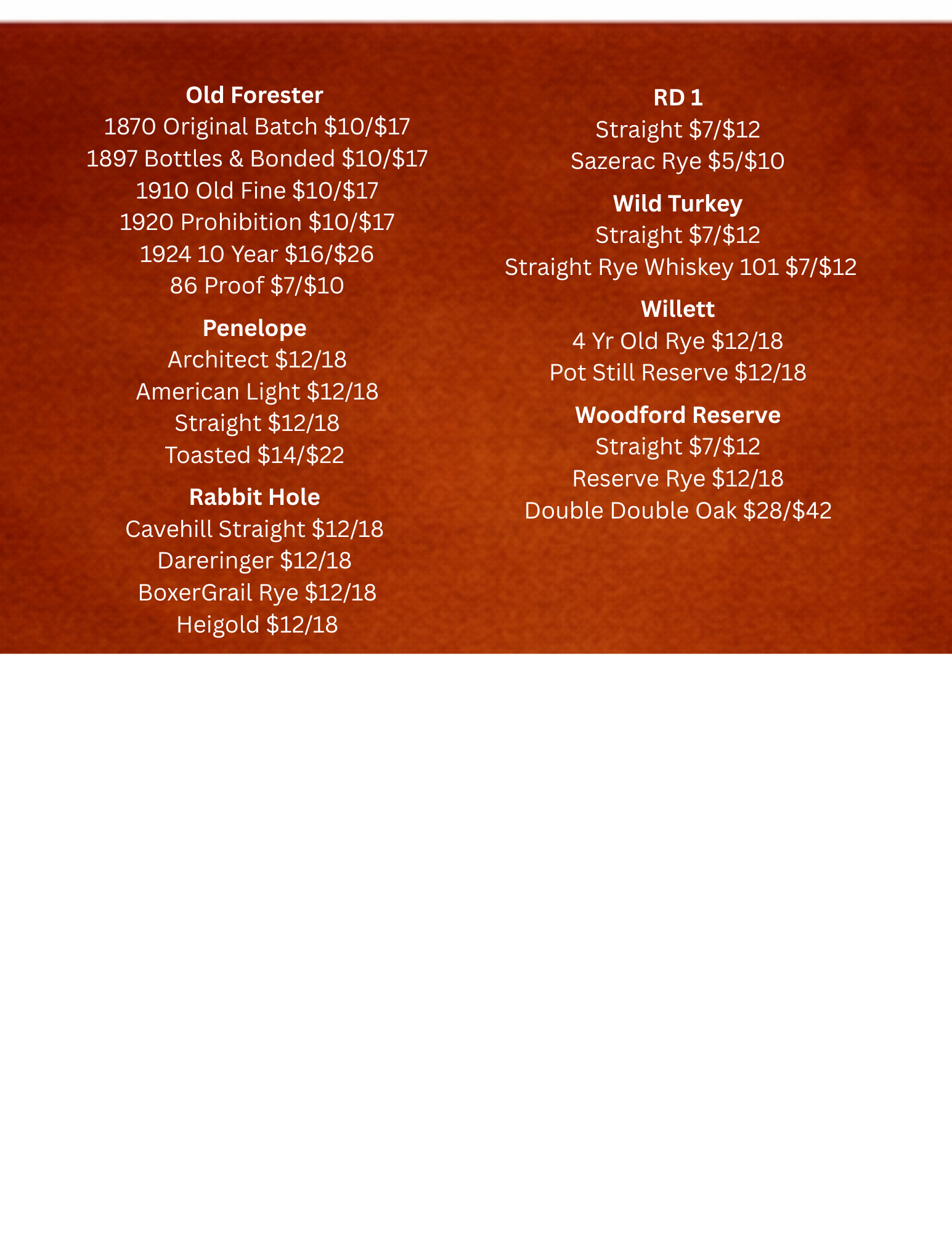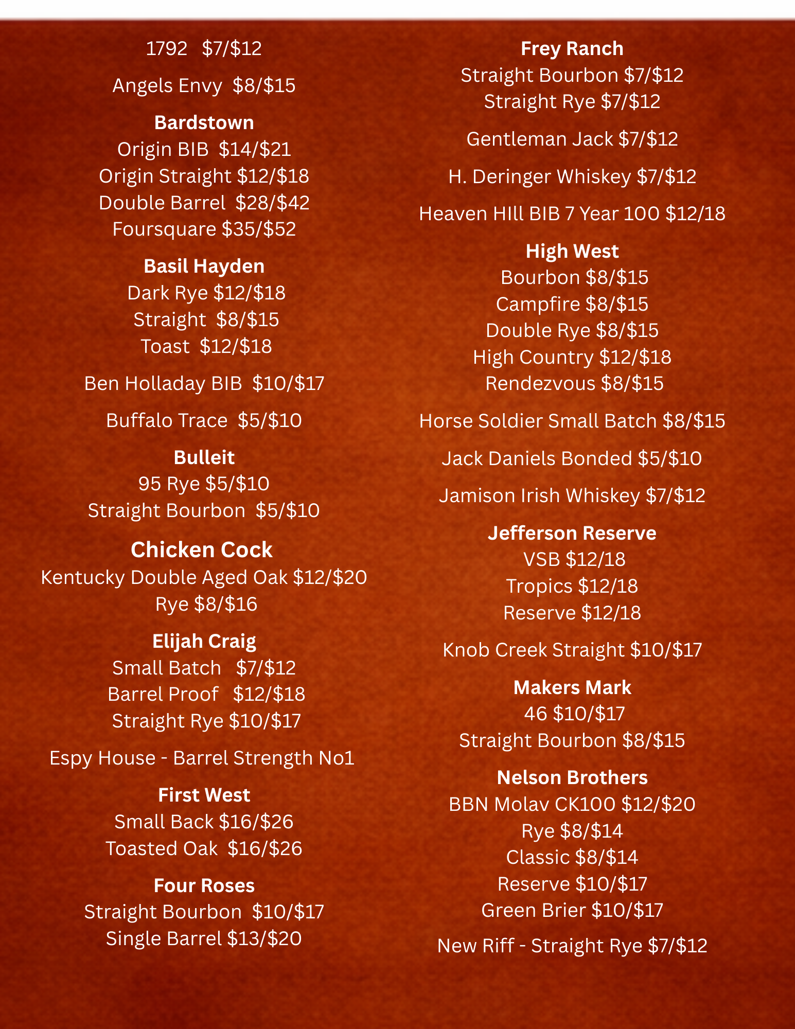 Bourbon Flights Double Oak FLight ~ $152 XO American oakChicken Cock Double OakWoodford Reserve Double OakWest Fork High Hamer Double Oak Old Forester FLight ~ $151870 Original Batch1897 Bottled in bond1910 old fine1920 Prohibition Rye FLight ~ $15Chicken Cock RyeSazerac RyeRabbit Hole RyeWoodford Rye OTHER SPIRITS VODKAWheatly ~ $4/$8Tito’s ~ $5/$10Grey Goose ~ $7/$14ABSOLUT WILD BERRY ~ $4/$8tHREE oLIVES vANILLA ~ $4/$8tHREE oLIVES cITRON ~ $4/$8RUMPlantation 3 Star ~ $5/$10Malibu ~ $5/$10Bumbu ~ $8/$16Plantation 5 yr Barbados ~ $8/$16CAPTAIN MORGAN ~ $5/$10BACARDI ~ $5/$10liqueursDisaronno Amaretto ~ $10/$20PALINI Limoncello ~$5/$10Gran Manier ~ $11/$22Kahlua ~ $6/$12bAILY’S iRISH CREAM ~ $7/$14 TEQUILACorralejo Blanco ~ $6/$12Milagro Silver ~ $6/$12Corralejo Reposado ~ $7/$14Avion Anejo ~ $14/$28Dinastia REAL - Premium Anejo ~ $9/$18Diastia REAL - Premium Extra Anejo Cristalino ~ $14/$28MI CAMPO BLANCO ~ $5/$10MI CAMPO REPOSADO 80 ~ $6/$12PATRON ~ $7/$14TRES GEN PLATA ~ $6/$12TRES GEN REPOSADO 80 ~ $7/$14JOSE CUERVO SILVER ~ $7/$14GINHendricks ~ $7/$14tHE bOTANIST ~ $6/$12BRANDYHennessy Cognac Very Special 80 ~ $8/$16Remy Martin 1738 Accord Royal ~ $10/$20 SCOTCHBALVENIE 12YR DOUBLEWOOD SINGLE BARREL ~ $7/$14bALVENIE 14YR CARIBBEAN CASK ~ $7/$14dEWERS wHITE ~ $10/$20gLENFIDDICH 12YR ~ $5/$10jOHNNIE wALKER bLACK ~ $7/$14jOHNNIE wALKER dOUBLE bLACK ~ $10/$20 wines WhitesAcres Away White ~ $6/GlassCountry Heritage Blaze ~ $6/Glass William Hill Chardonnay - $5/GlassKim Crawford Sauvignon Blanc - $10/GlassGlenbrook Chardonnay ~ $11/GlassWhite Haven Sauvignon Blanc~ $9/GlassCountry Heritage LaCrescent ~ $9/GlassOak Farm Albarino - $10/GlassCountry Heritage petite pearl ~ $7/GlassKendall Jackson Chardoney ~ $10 GlassNativ Greco Di Tufo ~ $40/BTLRombauer Cararus ~ $60 BTLSPARKLING Riondo Prosecco - $10/Glass Borgo San Pietra Rose’ Prosecco - $15 Glass/$35 BTLROSE`Cerasuolo D’Abruzzo Rose` ~ $30/BTL REDSAcres Away Red ~ $6/GlassCountry Hertiage Barrel Red ~ $4/GlassJ Vineyards Pinot Noir ~ $9/Glasssilk & spice ~ $9 GlassOak Farm Tievoli Red Blend ~ $10/Glassserial cabernet ~ $14/GlassHerencia La Palabra Malbec $15/GlassNativ Blu Onice Aglianico ~ $40/BTLSouthern Bell ~ $90 BtlLas Ninas Carmenere Syrah Blend ~ $10 Glass/$30 BTLsugar freeCountry Heritage slender White~ $10Country Heritage slender Blush ~ $10Flavored WinesCountry Heritage Blissful Blackberry ~ $8High Street Plum Wine~ $6 wine FLIGHTS rED wINES~ $18j VINEYARD pINOT nOIRLAS NINAS CARMENERE SYRAHCOUNTRY HERITAGE BARREL REDOAK FARM TIEVOLI RED BLEND wHITE WINES ~ $15cOUNTRY hERITAGE bLAZECOUNTRY HERITAGE LASCRESCENTOAK FARM ALBARINOWHITE HAVEN SAUVIGNON BLANC lOCAL wINERIES ~ $15ACRES AWAY WHITECOUNTRY HERITAGE BLAZEACRES AWAY ROSE`COUNTRY HERITAGE BARREL RED BEER Busch Light ~ $3Budweiser ~ $4Coors Banquet ~ $4Coors Light ~ $4Michelob Ultra ~ $4Miller Light ~ $4Yuengling Lager ~ $4Yuengling Flight ~ $4 on taprOTATING tAP ASK BARTENDER WHEN VISITING Guinness ~ $7Heineken ~ $5Dos Equis Lager ~ $5 Modelo ~ $5Stella Artois ~ $5 Non-AlcoholicO’Douls ~ $4Heineken 0.0 ~ $4 SELTER High NoonLime ~ $5Black Cherry Seltzer ~ $5